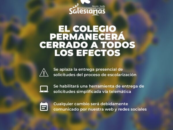Leer Más 25/abril 2020 Auxi y Bosco "El Coronavirus" Leer Más 18/marzo 2020 Tutorial para la Solicitud de admisión Leer Más 17/marzo 2020 Aclaración de admisión 2020-21 Leer Más 15/marzo 2020 El colegio permanecerá cerrado a todos los efectos Leer Más 12/marzo 2020 Suspensión presencial de la actividad docente Leer Más 11/marzo 2020 Centro mediador certificado Leer Más 08/marzo 2020 COVID-19 - Mensaje de la dirección Leer Más 08/marzo 2020 Momentos de cambios y posturas políticas que afectan considerablemente a nuestras instituciones educativas y colegios Leer Más 04/marzo 2020 DECRETO ESCOLARIZACIÓN Leer Más 27/febrero 2020 Comunicaciones marzo