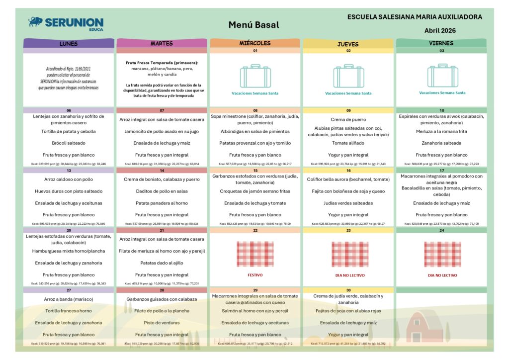 El comedor es un servicio que se ofrece de lunes a viernes para cualquier alumno que lo solicite. SERUNION es la empresa de restauración que promueve una alimentación inteligente (celíacos, alergias, …), fomentando el consumo de frutas, verduras, pescados y carnes, en cantidades y formas saludables, ofreciendo una dieta equilibrada y variada, y trabajando con los chicos en hábitos de vida saludables.